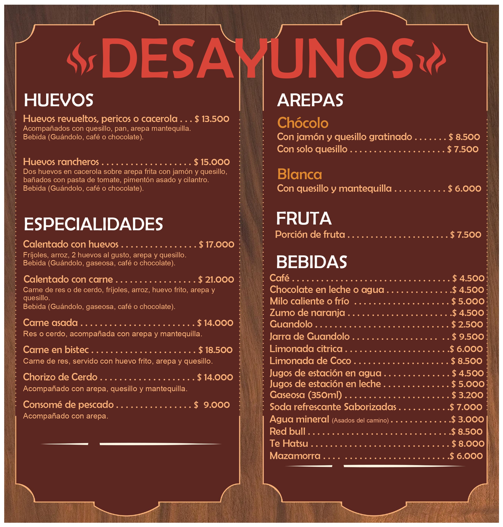 Helados sabores= chocolate, ron pasas, mora, chicle, fresa, galleta, vainilla Granizados Sabor variado= menta, rosas, piña, chicle, leche condensada