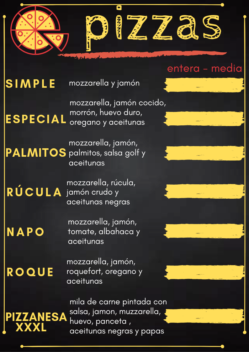 Pizzas, patacones, rolls, deditos de queso, papás fritas, chorrillanas y más.